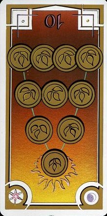 The 10 of Pentacles represents material posessions. The number 10 of Pentacles forms the links to the Ace (first card) of Wands (the first suit in the minor Arcana), and thus prepares to bring you back to the beginning of the minor Arcana, ready for a next cycle through the tarot.