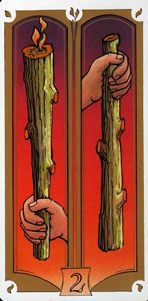 The 2 of Wands represents the research and digestion of a new idea. The number of this card and it's element are somewhat in conflict; while the 2 is focussed inwards, the Wand's element fire is outgoing. Fire wants to steam ahead while the blackbox 2 asks for patience.