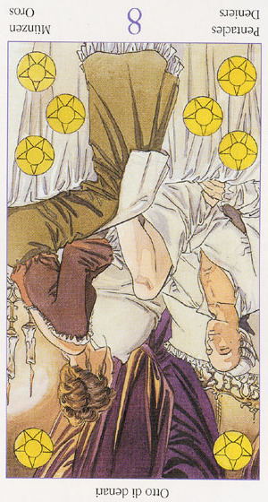 The 8 of Pentacles is about keeping up the hard work you're doing, and trying to be happy about doing that work at the same time. While the 3 of Pentacles is about completing a masterpiece, the 8 of Pentacles is about doing the apprentice work that makes you a master of your trade.