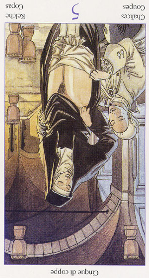 The 5 of Cups is about overcoming sadness and disappointment. You've let go of your old securities to embrace the new and exciting, now something has gone awry and you feel bad about that. But don't forget to notice those things that did go right.