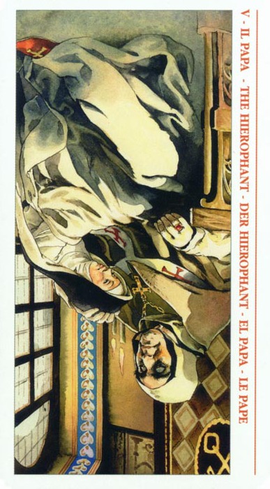 Where The Emperor is the chief of worldly power, The Hierophant is the head of spiritual matters.