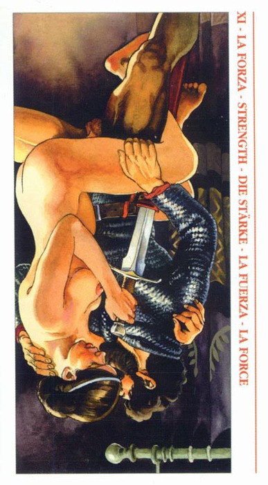 This card carries the number 11. In the Rider-Waite deck, Strength and Justice have swapped places because Waite saw links with the astrological signs Leo and Libra.