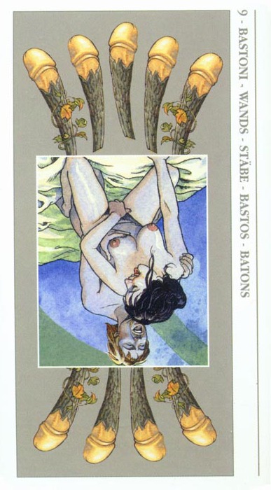 The 9 represents rest after work, which is another thing (like 8) that the element Fire associated with Wands is not very comfortable with. Fire likes to keep going. This rest will probably be spent thinking about what to do next along the course to completion.