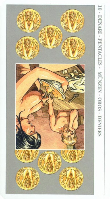 The 10 of Pentacles represents material posessions. The number 10 of Pentacles forms the links to the Ace (first card) of Wands (the first suit in the minor Arcana), and thus prepares to bring you back to the beginning of the minor Arcana, ready for a next cycle through the tarot.