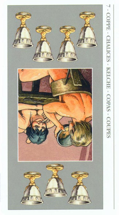 The 7 of Cups is about making a choice between different ideals. But Cups, with the water element, don't like making definitive choices that much, making this 7 in this suit a bit of a hard choice.