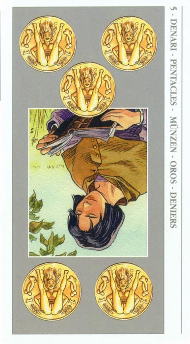 The 5 of Pentacles is an assignment-number card, and is about letting go of your securities. Pentacles element Earth (also) represents material posessions, so this card is about letting go of (some of) your worldly assets.