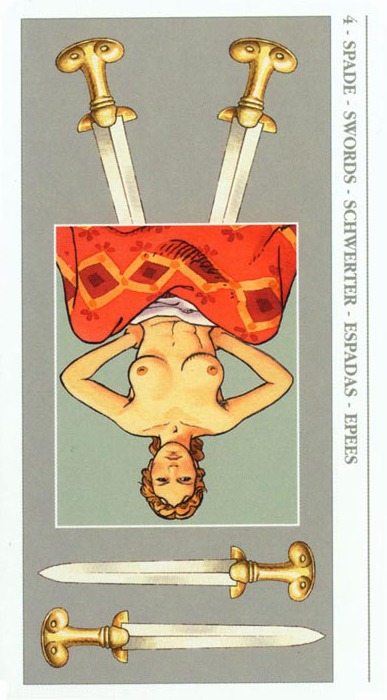 4 is the first number in the cycle of giving things shape. It's about making things real. The element of Swords also relates to making things real, so this enhances the effect so much that arrogance can cause you to exhaust yourself.