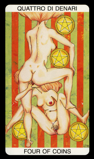 The 4 of Pentacles is about holding on to what you got. The number 4 represents structure and order, and fits well with the suit's element, Earth.