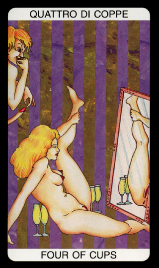 With the 4, the second cycle of this suit is commenced, where a choice between structure and feeling has to be made, where old securities have to be let go of to work towards a new future. But like Wands, Cups don't like structure much, they prefer to be free and dream rather than to make commitments and go for something.