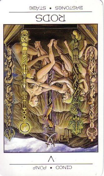The 5 of Wands represents competition. The 5 is the second assignment number, and therefore a difficult card. 5 combined with the Wand's element fire challenges you. You'll have to fight hard for your idea, but you stand a good chance of succeeding.