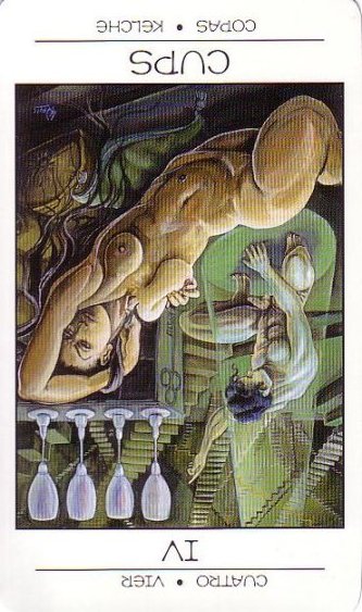 With the 4, the second cycle of this suit is commenced, where a choice between structure and feeling has to be made, where old securities have to be let go of to work towards a new future. But like Wands, Cups don't like structure much, they prefer to be free and dream rather than to make commitments and go for something.