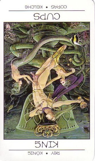 The King of Cups uses his intuition to achieve his ideals. Since Cups are turned inward, and Kings turned to the outside world, this card might be a difficult one, or it could be a powerful one.