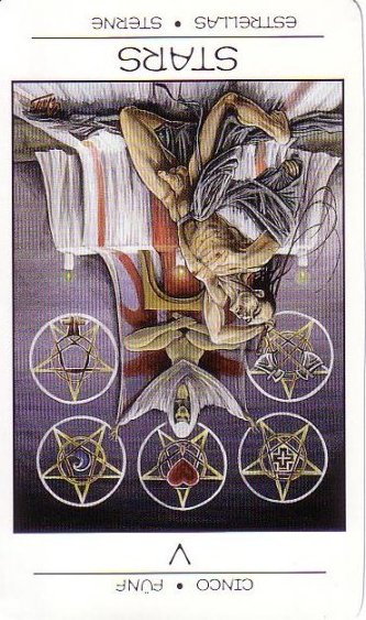 The 5 of Pentacles is an assignment-number card, and is about letting go of your securities. Pentacles element Earth (also) represents material posessions, so this card is about letting go of (some of) your worldly assets.