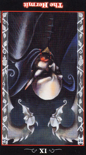 The Hermit shuts out the world and retreats into solitude to better understand some spiritual aspect of life. He opens to the cosmos and lets it's wisdom sink in. Hermits are often seen as wise old men who can guide a traveller along a journey.