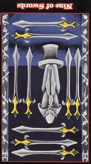The 9 of Swords represents relief from cropped-up grief. The number 9 is a number of reward and rest and accomplishment. In the element of Swords there is not a lot of time for rest, but without any rest you'd just burn yourself out.
