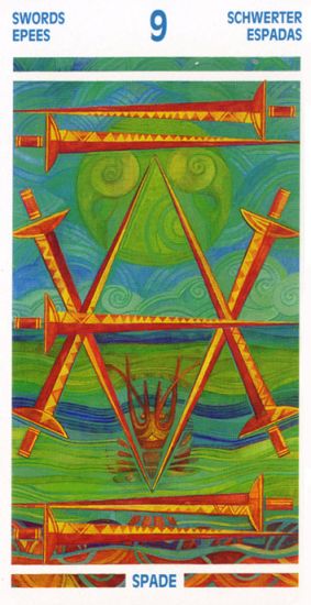 The 9 of Swords represents relief from cropped-up grief. The number 9 is a number of reward and rest and accomplishment. In the element of Swords there is not a lot of time for rest, but without any rest you'd just burn yourself out.
