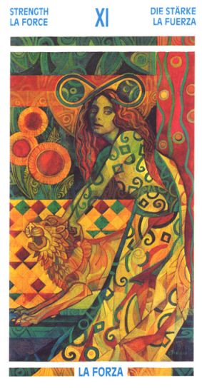 This card carries the number 11. In the Rider-Waite deck, Strength and Justice have swapped places because Waite saw links with the astrological signs Leo and Libra.