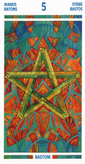 The 5 of Wands represents competition. The 5 is the second assignment number, and therefore a difficult card. 5 combined with the Wand's element fire challenges you. You'll have to fight hard for your idea, but you stand a good chance of succeeding.