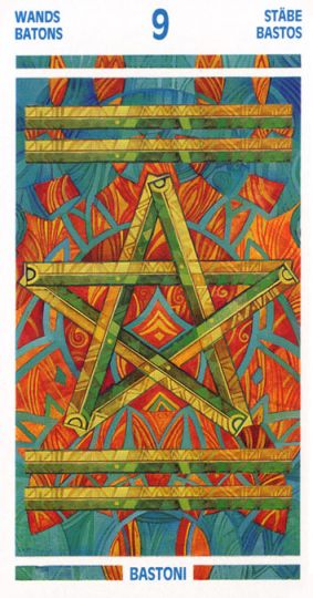 The 9 represents rest after work, which is another thing (like 8) that the element Fire associated with Wands is not very comfortable with. Fire likes to keep going. This rest will probably be spent thinking about what to do next along the course to completion.