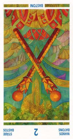 The 2 of Wands represents the research and digestion of a new idea. The number of this card and it's element are somewhat in conflict; while the 2 is focussed inwards, the Wand's element fire is outgoing. Fire wants to steam ahead while the blackbox 2 asks for patience.