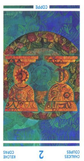 This the first assignment number of the Cups suit. Unlike Wands, with the Fire element, Cups, with the water element, has a lot more patience. Water is by nature more introspective, and this second card in the Cups suit is indeed about exploring yourself. The outcome is uncertain as always, but it usually results in better acceptance of yourself.