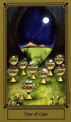The 9 of Cups represents achievement and contentment. It is an excellent time to take some rest and enjoy yourself.