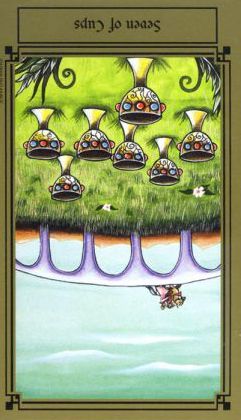 The 7 of Cups is about making a choice between different ideals. But Cups, with the water element, don't like making definitive choices that much, making this 7 in this suit a bit of a hard choice.