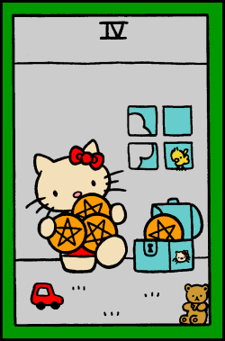The 4 of Pentacles is about holding on to what you got. The number 4 represents structure and order, and fits well with the suit's element, Earth.