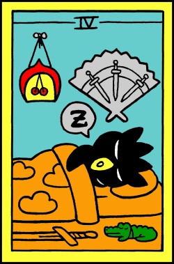 4 is the first number in the cycle of giving things shape. It's about making things real. The element of Swords also relates to making things real, so this enhances the effect so much that arrogance can cause you to exhaust yourself.