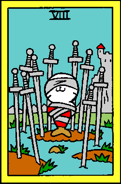 The 8 of Swords is about slowly regaining strength and energy. The 8 is an assignment number, and in the element of Swords it's a bit harder than usual.