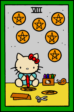 The 8 of Pentacles is about keeping up the hard work you're doing, and trying to be happy about doing that work at the same time. While the 3 of Pentacles is about completing a masterpiece, the 8 of Pentacles is about doing the apprentice work that makes you a master of your trade.