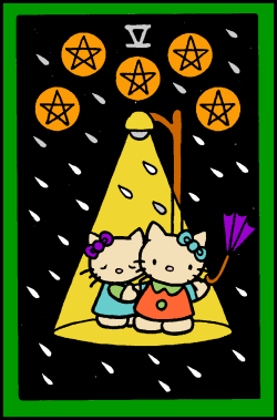 The 5 of Pentacles is an assignment-number card, and is about letting go of your securities. Pentacles element Earth (also) represents material posessions, so this card is about letting go of (some of) your worldly assets.