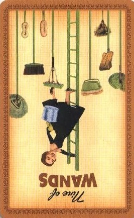 The 9 represents rest after work, which is another thing (like 8) that the element Fire associated with Wands is not very comfortable with. Fire likes to keep going. This rest will probably be spent thinking about what to do next along the course to completion.