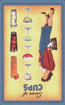 The 7 of Cups is about making a choice between different ideals. But Cups, with the water element, don't like making definitive choices that much, making this 7 in this suit a bit of a hard choice.