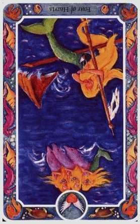 With the 4, the second cycle of this suit is commenced, where a choice between structure and feeling has to be made, where old securities have to be let go of to work towards a new future. But like Wands, Cups don't like structure much, they prefer to be free and dream rather than to make commitments and go for something.
