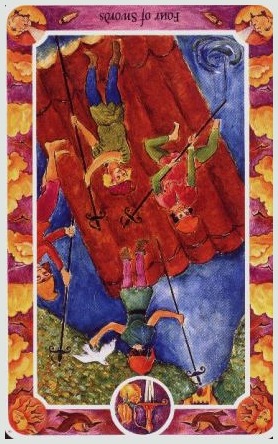 4 is the first number in the cycle of giving things shape. It's about making things real. The element of Swords also relates to making things real, so this enhances the effect so much that arrogance can cause you to exhaust yourself.
