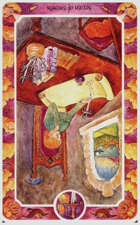 The 7 of Swords is about making slow progress because you can't trust the situation and/or people around you.