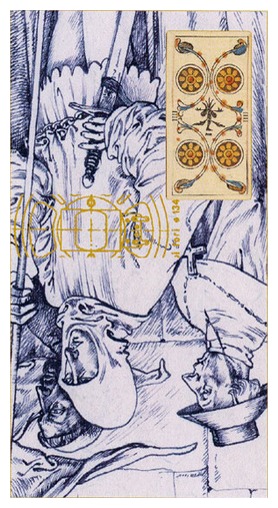 4 is the first number in the cycle of giving things shape. It's about making things real. The element of Swords also relates to making things real, so this enhances the effect so much that arrogance can cause you to exhaust yourself.