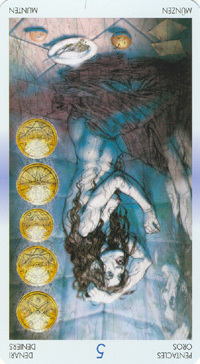 The 5 of Pentacles is an assignment-number card, and is about letting go of your securities. Pentacles element Earth (also) represents material posessions, so this card is about letting go of (some of) your worldly assets.