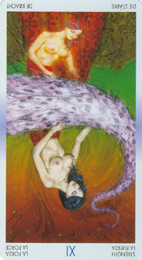 This card carries the number 11. In the Rider-Waite deck, Strength and Justice have swapped places because Waite saw links with the astrological signs Leo and Libra.