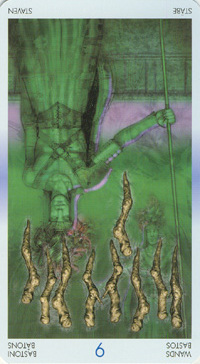 The 9 represents rest after work, which is another thing (like 8) that the element Fire associated with Wands is not very comfortable with. Fire likes to keep going. This rest will probably be spent thinking about what to do next along the course to completion.