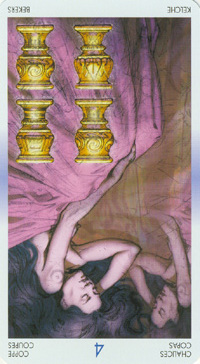 With the 4, the second cycle of this suit is commenced, where a choice between structure and feeling has to be made, where old securities have to be let go of to work towards a new future. But like Wands, Cups don't like structure much, they prefer to be free and dream rather than to make commitments and go for something.