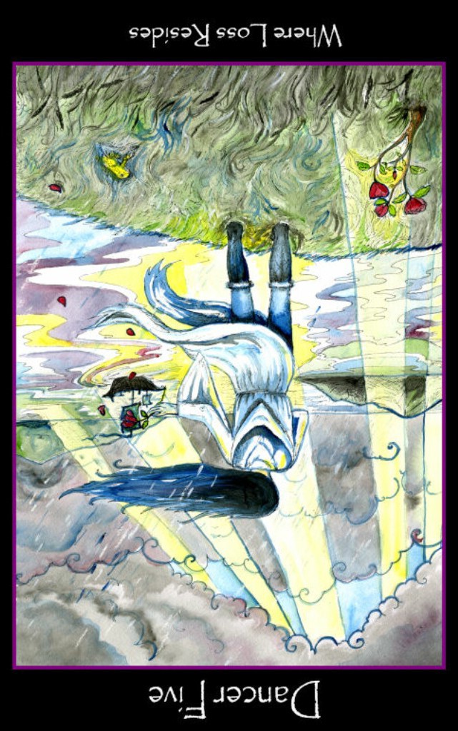 The 5 of Cups is about overcoming sadness and disappointment. You've let go of your old securities to embrace the new and exciting, now something has gone awry and you feel bad about that. But don't forget to notice those things that did go right.