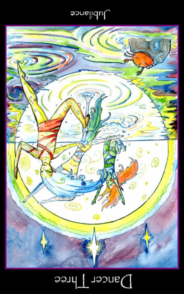 The person in the center of the card has completed many journeys already, and is completely at ease. Yet she continues to move, for having reached your goals is no reason to stop moving.
