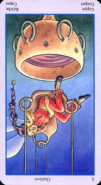 With the 4, the second cycle of this suit is commenced, where a choice between structure and feeling has to be made, where old securities have to be let go of to work towards a new future. But like Wands, Cups don't like structure much, they prefer to be free and dream rather than to make commitments and go for something.
