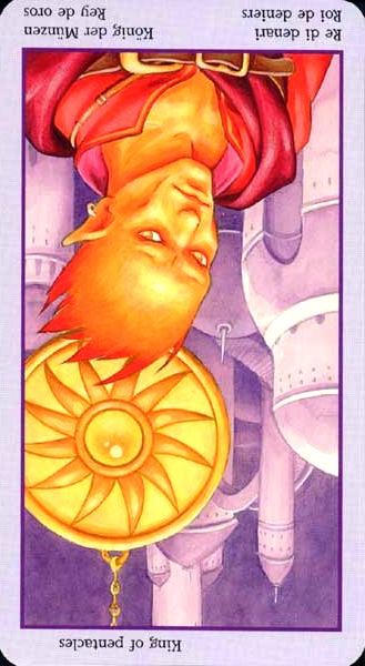 The King of Pentacles uses his Earthly attributes to rule. He goes about his work like an old style business man; he avoids unnecessary risks, aims for real results, and acts from confidence.
