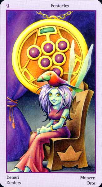 The 9 of Pentacles represents earned rest. The element Earth, attached to the Pentacles suit, appreciates the rest that completion of hard work brings. This is a good time for games and relaxation.