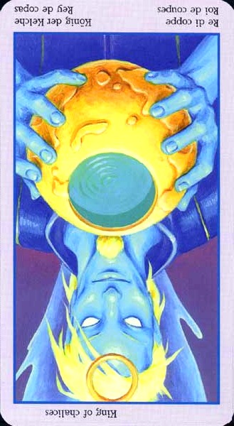 The King of Cups uses his intuition to achieve his ideals. Since Cups are turned inward, and Kings turned to the outside world, this card might be a difficult one, or it could be a powerful one.