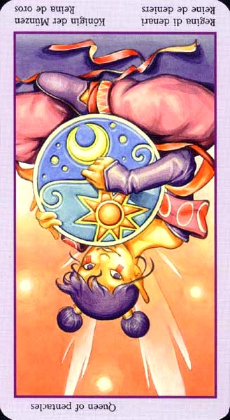 The Queen in the suit of Pentacles becomes aware of her Earthly attributes; she's reliable and sober, able to give good advice.