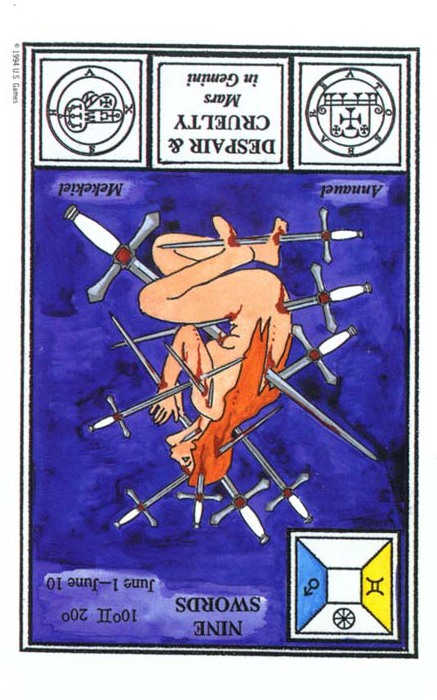The 9 of Swords represents relief from cropped-up grief. The number 9 is a number of reward and rest and accomplishment. In the element of Swords there is not a lot of time for rest, but without any rest you'd just burn yourself out.